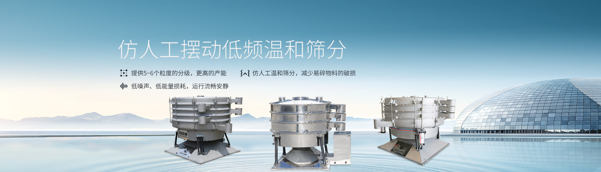 | 可篩分5個粒度,篩體直徑600mm~2600mm;對于單一分級的產(chǎn)品,可以幫助您在同一臺篩子上獲得雙倍甚至更高的產(chǎn)能。 | 擺動篩的原理實際上是機(jī)械的模擬人類的手篩。平緩的加速配合低速運轉(zhuǎn)以確保物料始終滾動在篩網(wǎng)的表面。尤其對于干燥的,密度低的顆粒;還能減少高研磨性的產(chǎn)品對篩子本身(尤其是篩網(wǎng))磨損。 | 物料從幾乎水平運動的篩體中心進(jìn)料,沿螺旋曲線向外圍發(fā)散。與此同時,隨著垂直加速度的加大迫使細(xì)顆粒的產(chǎn)品有效透過篩網(wǎng)表面。 | ||