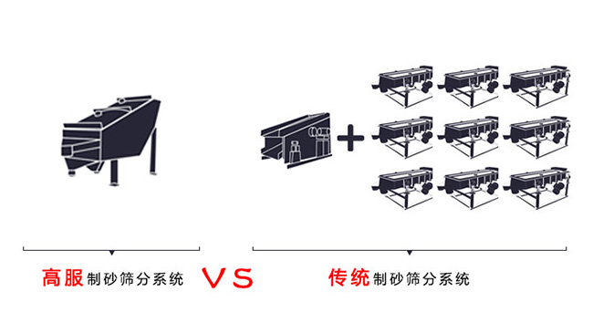 高服制砂篩分系統(tǒng)一臺(tái)GLS概率篩可分級(jí)多種規(guī)格,產(chǎn)量每小時(shí)可以達(dá)到50-250噸以上,投入成本低、占地少,概率篩可以安裝清網(wǎng)裝置,避免堵孔現(xiàn)象,傳統(tǒng)制砂篩分系統(tǒng)篩分孔徑小至5mm且多至3層,5mm以下需要加篩分設(shè)備,且產(chǎn)量低,增加成本和占地面積。 |