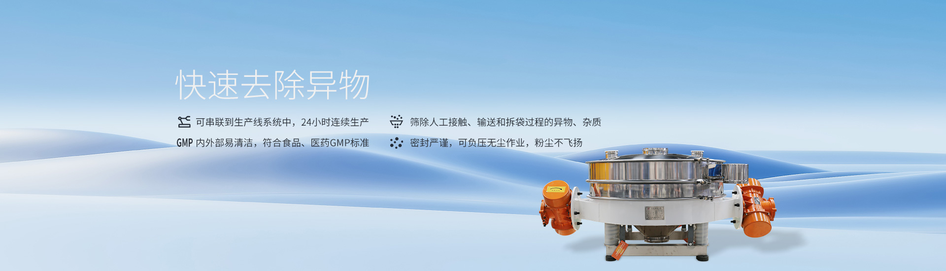 | 進(jìn)出料口設(shè)計(jì)在同一垂直方向,篩下成品快速過網(wǎng),減少物料在篩面停留時(shí)間,大幅提升篩分產(chǎn)量。 | 電機(jī)設(shè)計(jì)在設(shè)備外側(cè),降低設(shè)備高度,使空間有效利用;設(shè)備操作方便,大鈍角好清理。 | 單振源可以直接串聯(lián)在管道中使用,除去管道中的異物和雜質(zhì),無需人工操作,避免物料二次污染。 | ||