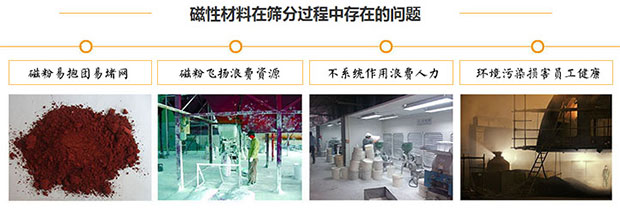 磁性材料的生產(chǎn)工序復(fù)雜,在生產(chǎn)過(guò)程中,難免會(huì)有結(jié)塊、工業(yè)雜質(zhì)和二次污染物進(jìn)入原料中,影響到品質(zhì)。所以,到后面都要進(jìn)行篩分除雜。由于磁性材料本身硬度高、粘性大、易抱團(tuán)和易飛揚(yáng);所以,生產(chǎn)過(guò)程中的篩分問(wèn)題一直難以解決。北礦磁材的工程師也經(jīng)過(guò)多次實(shí)驗(yàn),使用振動(dòng)篩、超聲篩或運(yùn)用風(fēng)選及類似氣流篩的設(shè)備,